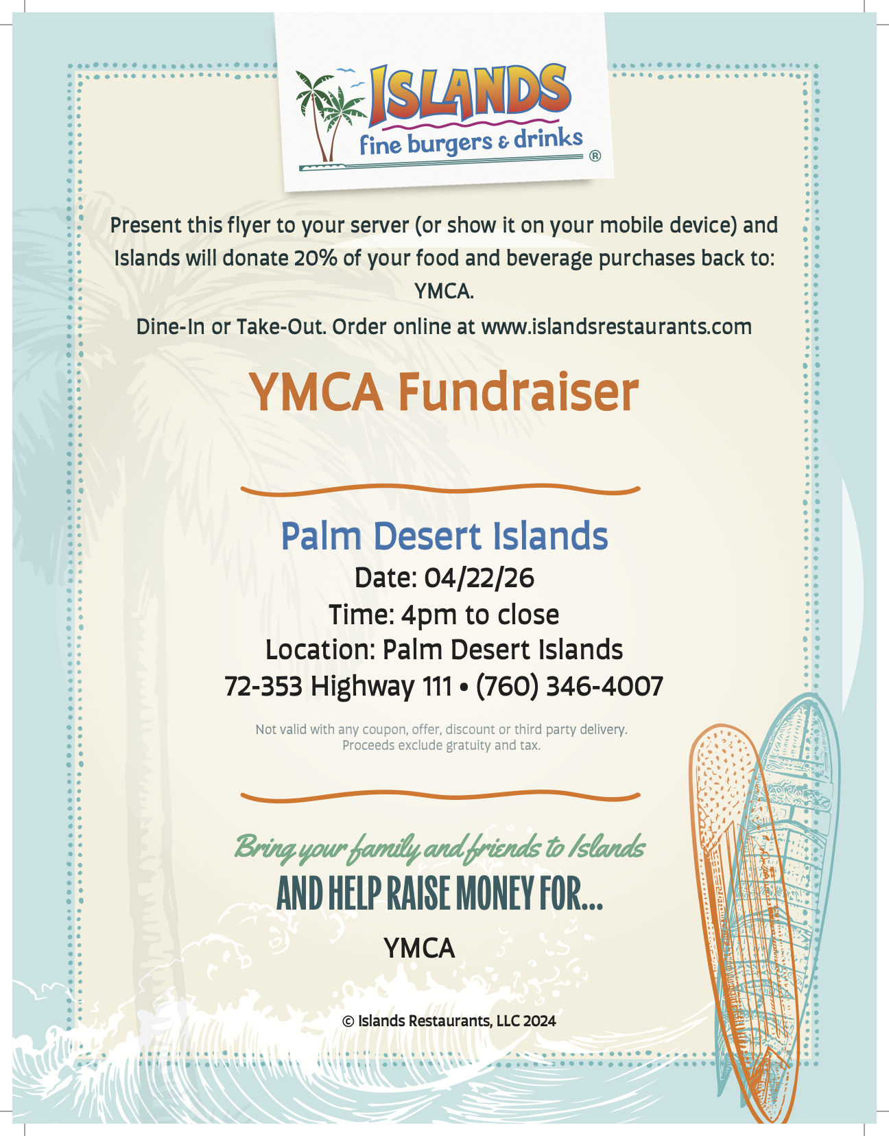 Join us for a delicious way to give back at the YMCA Fundraiser hosted by Islands Fine Burgers in Palm Desert! On April 22, 2026, from 4 PM to closing, simply dine in or order takeout and present this flyer (or show it on your phone), and 20% of your food and beverage purchase will be donated back to the YMCA. Bring your family and friends to enjoy great food while supporting programs that strengthen our community.