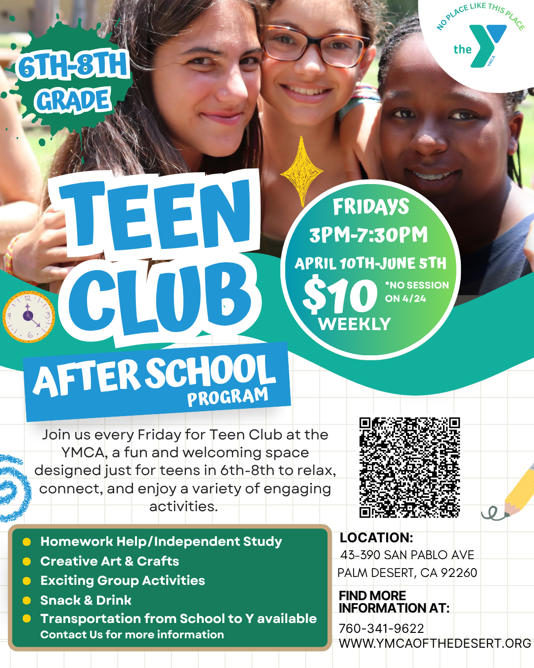 Join us every Friday for Teen Club at the YMCA, a fun and welcoming space designed just for teens in 6th to 8th grades to relax, connect, and enjoy a variety of engaging activities!